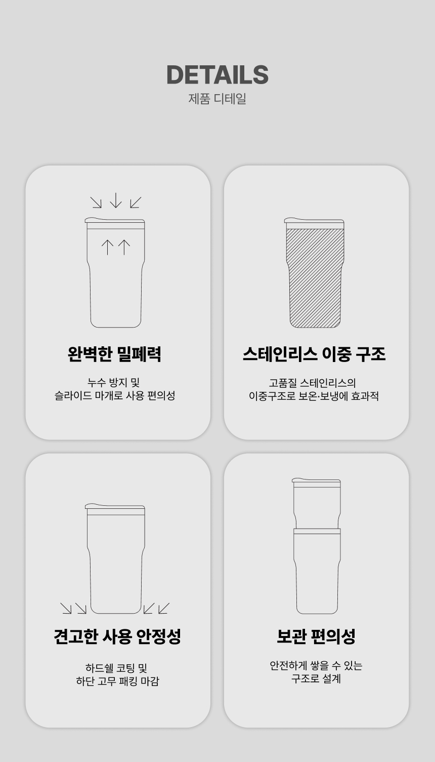 이중 스테인레스 구조와 뛰어난 밀폐력, 하단 고무 패드로 미끄럼 방지까지